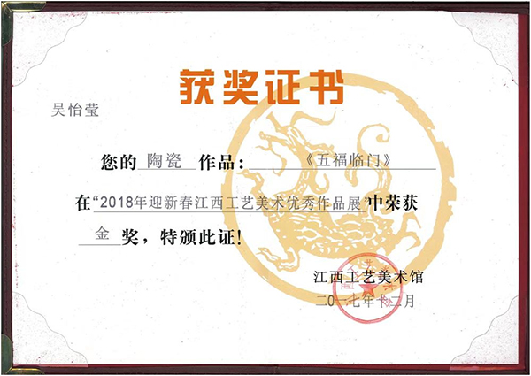 2018年《五福臨門》2018迎新春江西工藝美術(shù)優(yōu)秀作品展榮獲金獎(jiǎng)