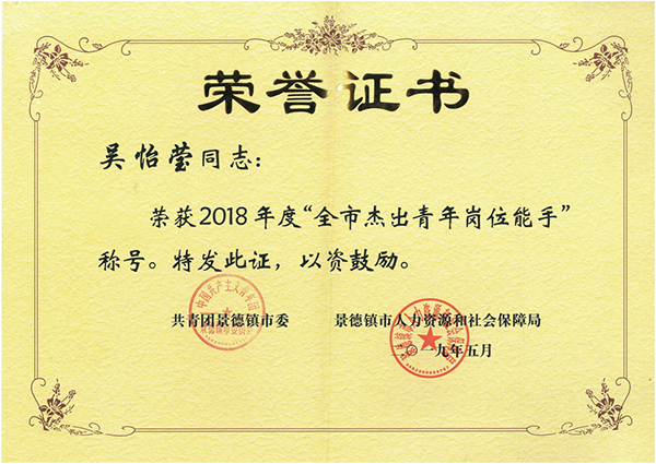 2018年度榮獲景德鎮(zhèn)市“全市青年崗位能手”稱號
