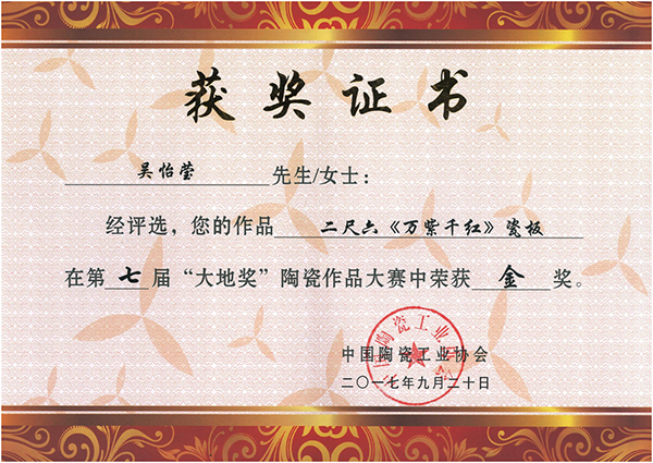 2017年《萬紫千紅》獲中國陶瓷工業(yè)協(xié)會(huì)“大地杯”金獎(jiǎng)