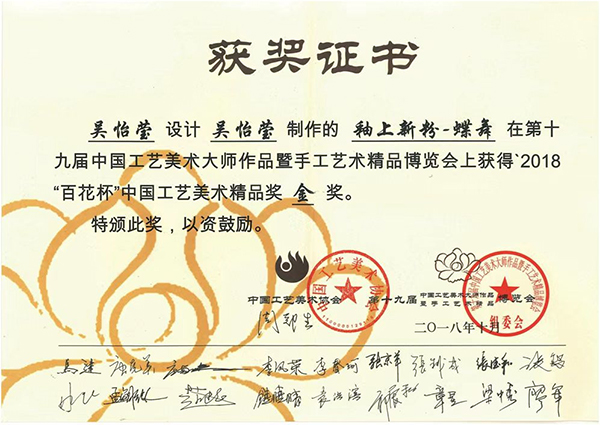 2018年《蝶舞》獲中國工藝美術(shù)協(xié)會(huì)“百花杯”金獎(jiǎng)