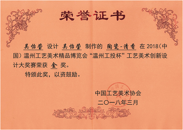 2018年《清香》獲中國工藝美術(shù)協(xié)會(huì)“溫州工投杯”金獎(jiǎng)