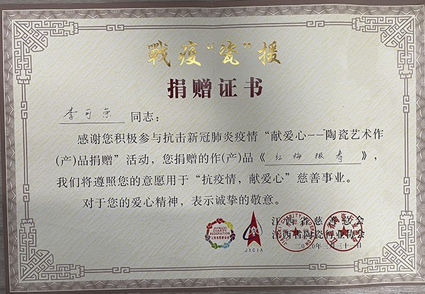 2020年抗擊新冠肺炎疫情獻愛心陶瓷藝術作品捐贈“紅梅報春”。