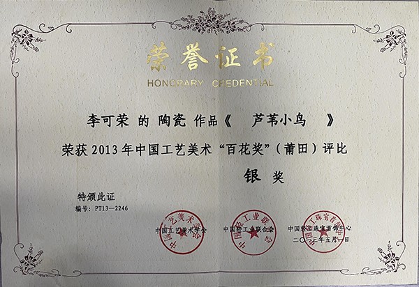 2013年中國工藝美術百花獎“蘆葦小鳥”榮獲銀獎。