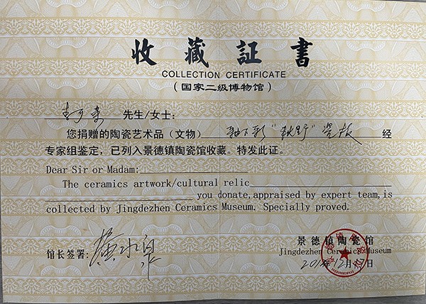 2012年青花“晨曲”200件瓶被江西省工藝美術館收藏。