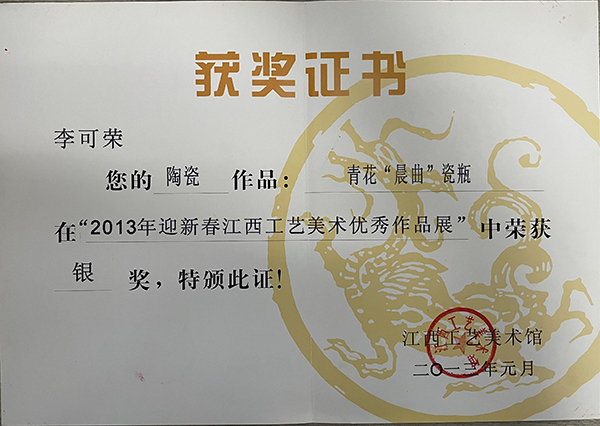 2013年迎新春江西工藝美術優(yōu)秀作品展“晨曲”榮獲銀獎。