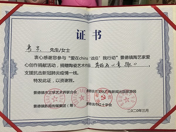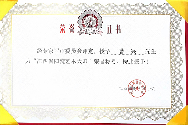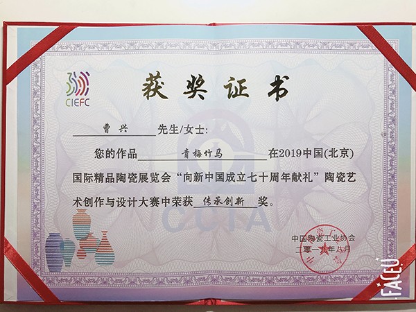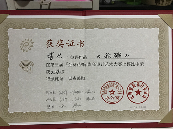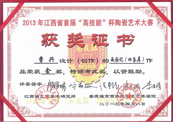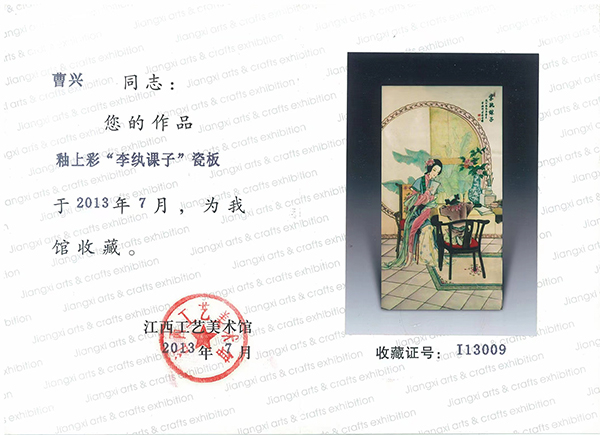 2013年粉彩瓷板作品《李紈課子》榮獲“江西工藝美術(shù)優(yōu)秀作品”大獎(jiǎng)賽金獎(jiǎng),并且 被江西工藝美術(shù)館收藏。